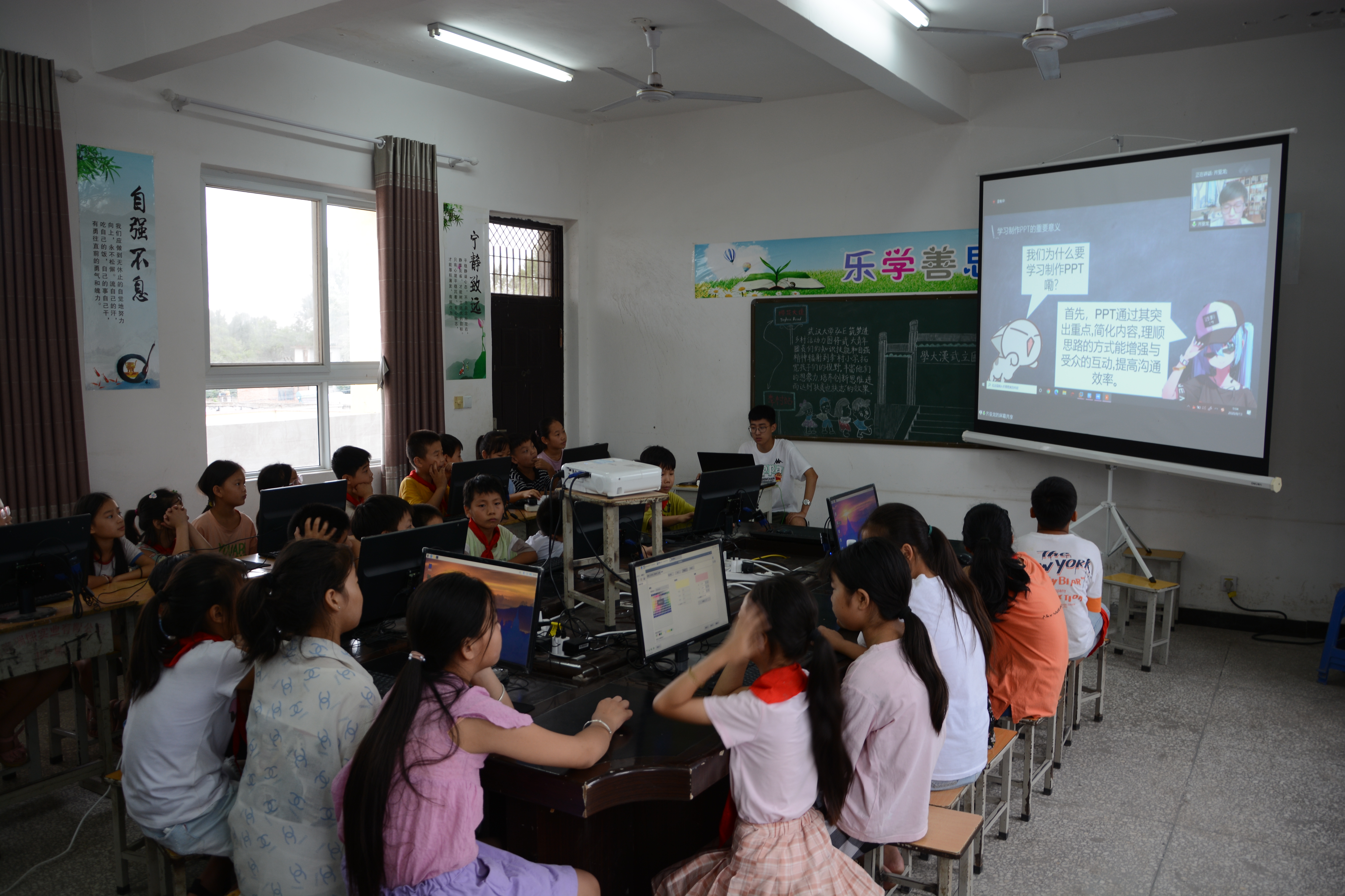 活动过程中,武汉大学“弘E筑梦”暑期实践团队更新维护了武汉大学2019年捐赠给李村小学的计算机设备,为学校增添了主机、路由器、音响等信息化设备,为云端教学做好准备。团队通过“云端+线下”的形式开展自编课程教学,由内容组成员进行云端教学,线下实践组成员进行现场管理、解惑,在为期七天的时间内,讲解了计算机基础知识,教会了孩子们计算机基本操作、打字以及WORD、EXCEL和PPT等基础软件的应用。课余时间里,团队还到李村甜瓜小镇和扶贫车间了解村集体经发展情况,对接企业需求,共商后续在自动控制和企业管理方面的帮扶措施。最后,在夏令营结营仪式上,李村小学学生们展示了他们用基础软件制作的优秀作品,同时通过云端直播平台进行网上同步直播。