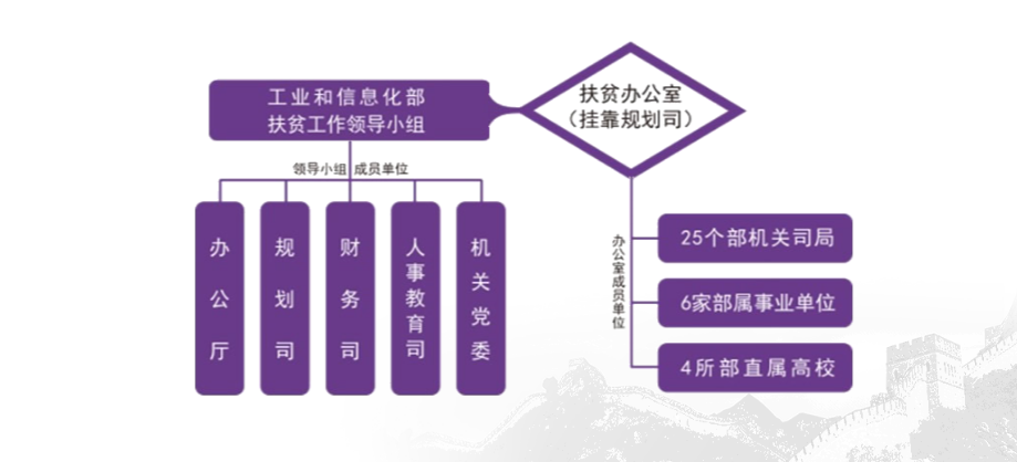 工业和信息化部成立了扶贫工作领导小组。领导小组成员单位包括办公厅、规划司、财务司、人事教育司、机关党委;设立扶贫办公室(挂靠规划司),成员单位包括25个部机关司局、6家部属事业单位和4所部属高校,实现了扶贫责任全覆盖。