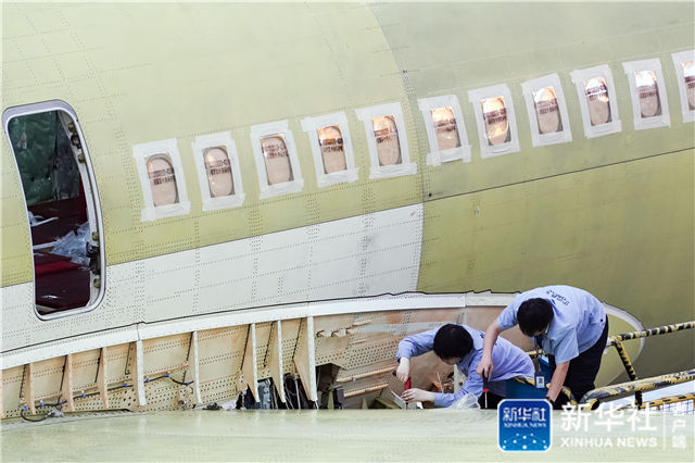工人在中国商飞上海飞机制造有限公司的C919总装生产线进行装配(7月5日摄)。新华社记者 沈伯韩 摄