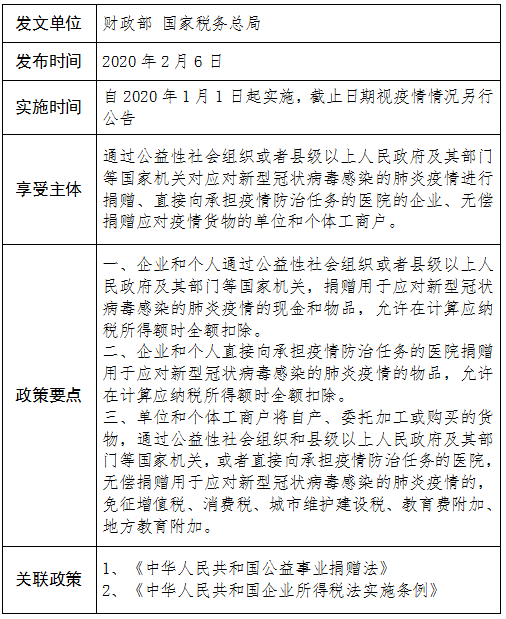 《关于支持新型冠状病毒感染的肺炎疫情防控有关捐赠税收政策的公告》(财政部 税务总局公告2020年第9号)政策要点