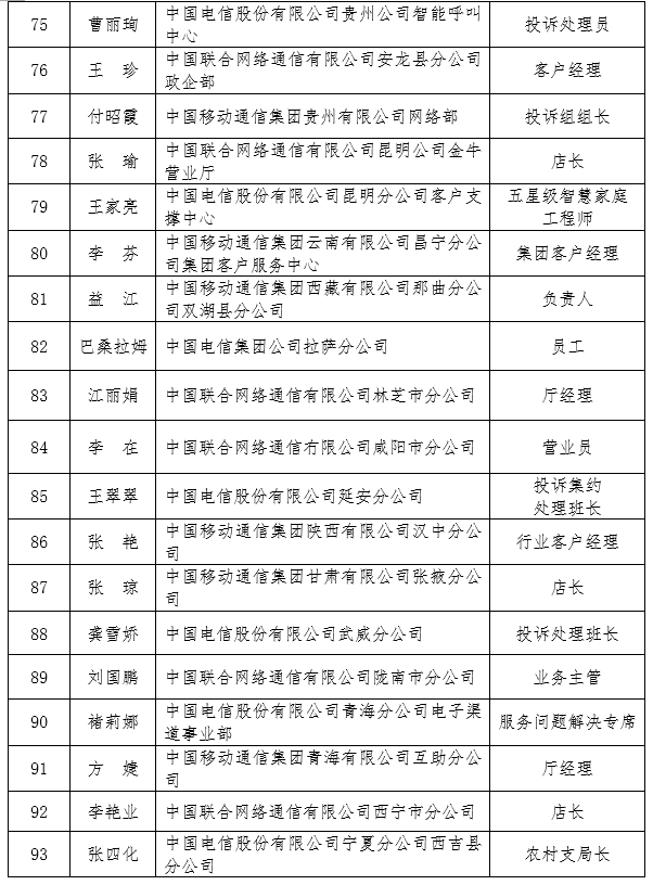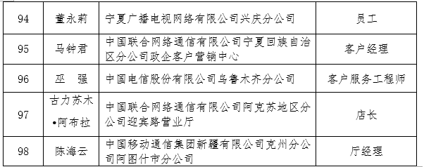 通过各相关企业基层单位申报,各通信管理局审核推荐,专家评审和社会公示,工业和信息化部行风建设领导小组决定授予张娜等98名个人“全国用户满意电信服务明星”称号,授予中国联合网络通信有限公司北京市分公司客服呼叫中心集中处理专席等31个班组“全国用户满意电信服务明星班组”称号(名单详见附件),并分别颁发荣誉证书和奖牌以资鼓励。