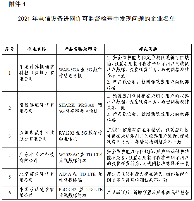 (三)加强电信设备事中事后监管。组织开展电信设备获得进网许可证前后一致性的监督检查工作,随机抽查了16家企业的16款产品,发现其中6款产品存在不同程度的安全防护能力缺陷、新增预置应用未报备等问题(详见附件4)。工业和信息化部已督促相关企业对发现的问题进行整改。