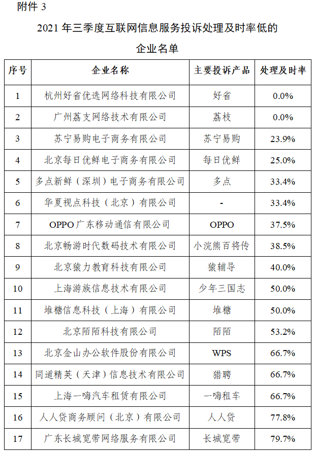 附件3.2021年三季度互联网信息服务投诉处理及时率低的企业名单.wps