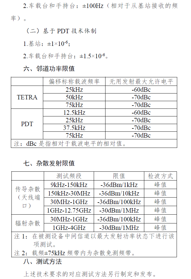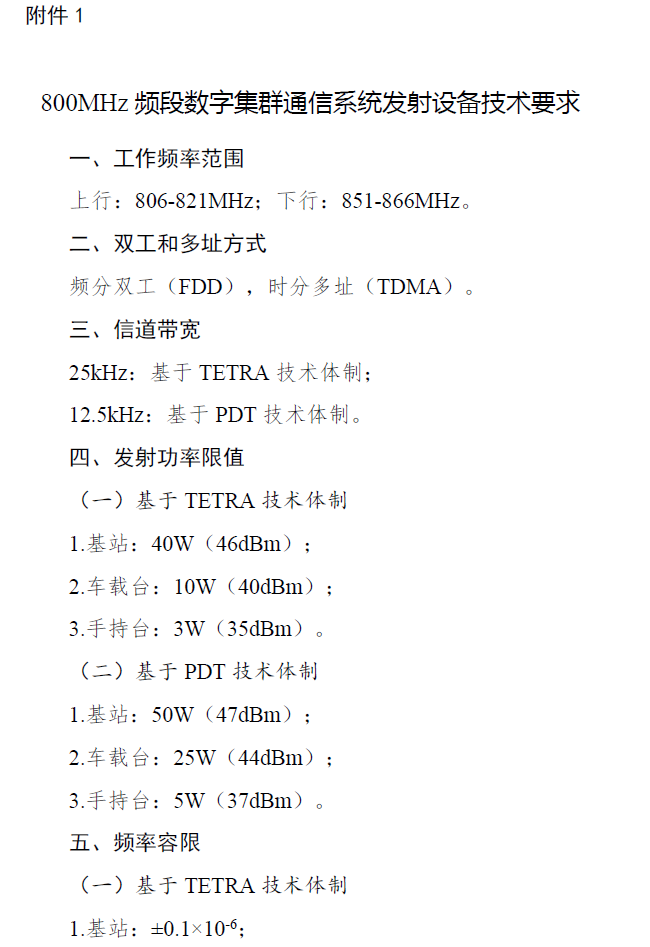 一、新增基于PDT(专用数字集群通信系统)技术体制的数字集群通信系统使用800MHz频段,基于iDEN、GoTa和GT800技术体制的数字集群通信系统不再规划使用800MHz频段。相关系统的无线电发射设备技术要求详见附件1。