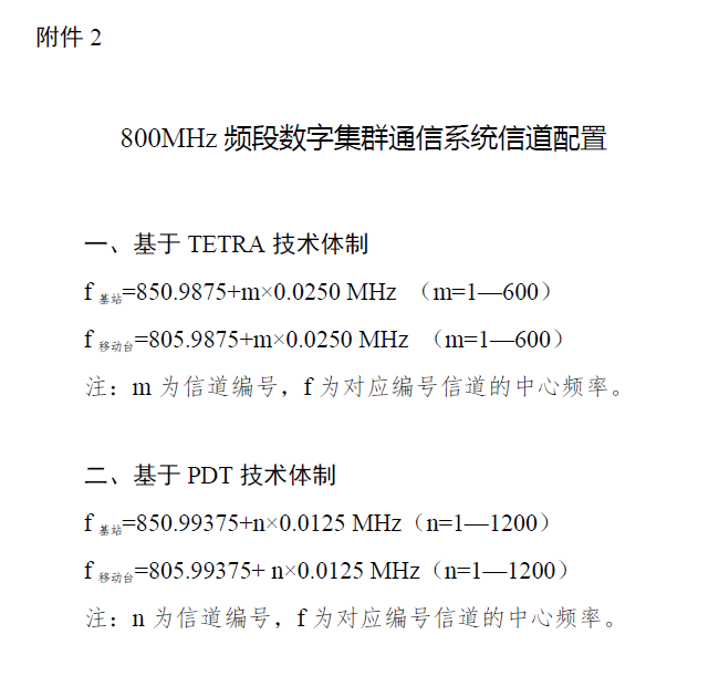 二、800MHz频段基于PDT技术体制的数字集群通信系统共划分1200个信道,相关系统信道配置详见附件2。