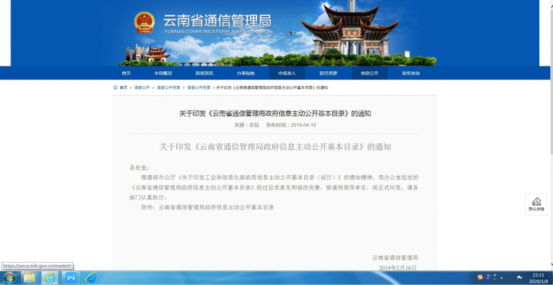 2019年,我局通过政府网站及时公开各项监管工作情况及工作动态,在网站上宣传国家电信监管政策、相应的法律法规,公布相关的规范性文件,公布关于办理许可的相关事项;公开行政处罚相关信息,公开取得云南省通信管理局许可或批准的增值电信企业名单。其中,工作动态栏目68条,通知公告36条,局机关党建工作专题栏目34条,从严治党专题栏目5条,防范打击通讯信息诈骗工作专题栏目1条,市场准入栏目11条,部省要闻456条,云南通信业发展情况10条,服务质量4条、警示益民1条,政务咨询4条,群众信箱2条,2019年我局发布各类政务信息共计600余条。